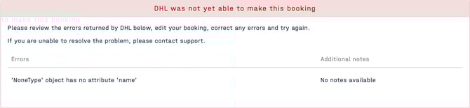 This error usually means that there is an error on DHL's side, or on the configuration itself. If we don't have your DHL account manager's details, we encourage you to provide them, so we can reach out to DHL on your behalf and work to resolve this issue. I will reach out to you via our the support@the7bridges.com email.