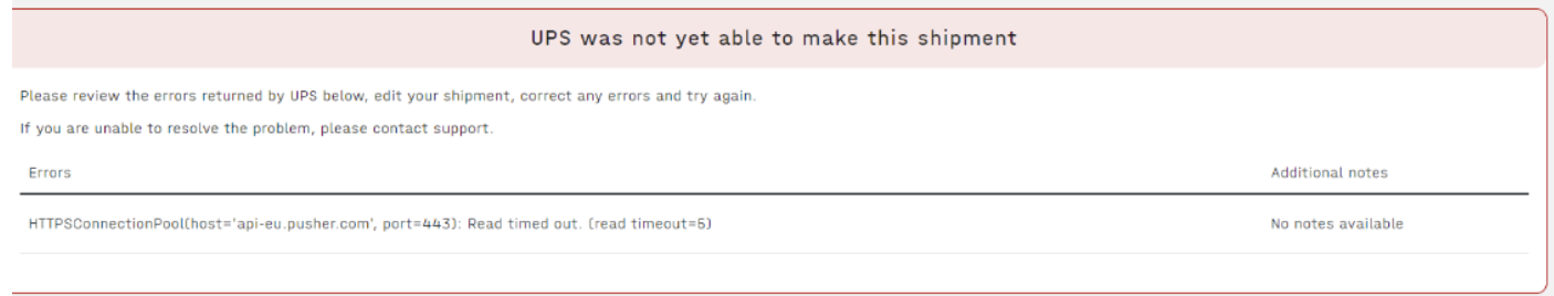 This is a connectivity issue with the shipping API at UPS, where the task to book the shipment is taking too long to respond. This should resolve itself eventually (the average from what we have seen is 30 minutes).