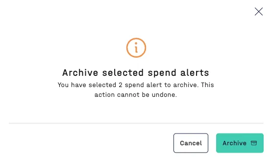 - Spend alerts can also be archived if they are not applicable. However, please note, once archived the spend alert cannot be undone, the following warning message will be displayed: